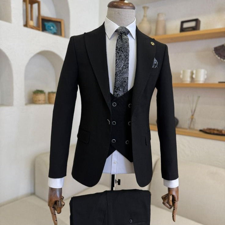 Icône du chic intemporel, le Costume Noir Louvre symbolise l’élégance absolue. Sa coupe trois pièces impeccablement taillée et ses finitions soignées en font une pièce d’exception. Polyvalent et prestigieux, il s’adapte aussi bien aux grandes soirées qu’aux occasions formelles où le raffinement est essentiel.